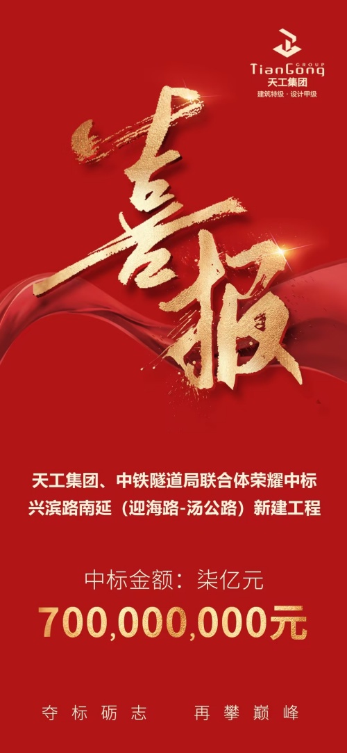 10月10日,浙江天工建设集团有限公司与中铁隧道局联合体荣耀中标兴滨路南延(迎海路-汤公路)新建工程,中标金额约7.08亿元。